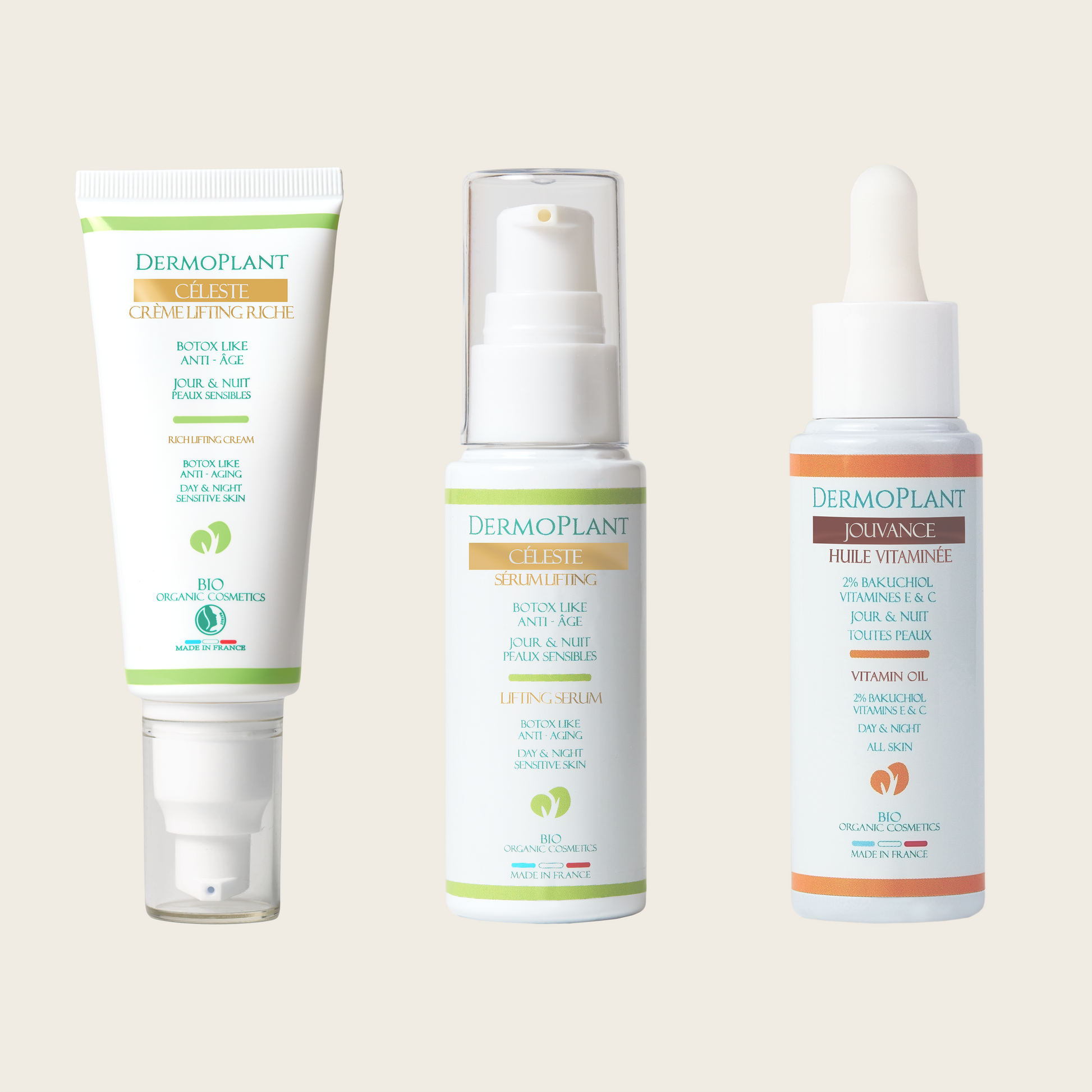 Ce pack réunit des soins riches et concentrés, spécialement formulés pour les peaux matures qui cherchent à nourrir intensément, préserver leur élasticité et révéler un teint éclatant. Grâce à des ingrédients précieux comme le bakuchiol, l’huile d’argousier, l’acide hyaluronique, et des peptides, cette routine apporte confort, hydratation et une sensation de fermeté.